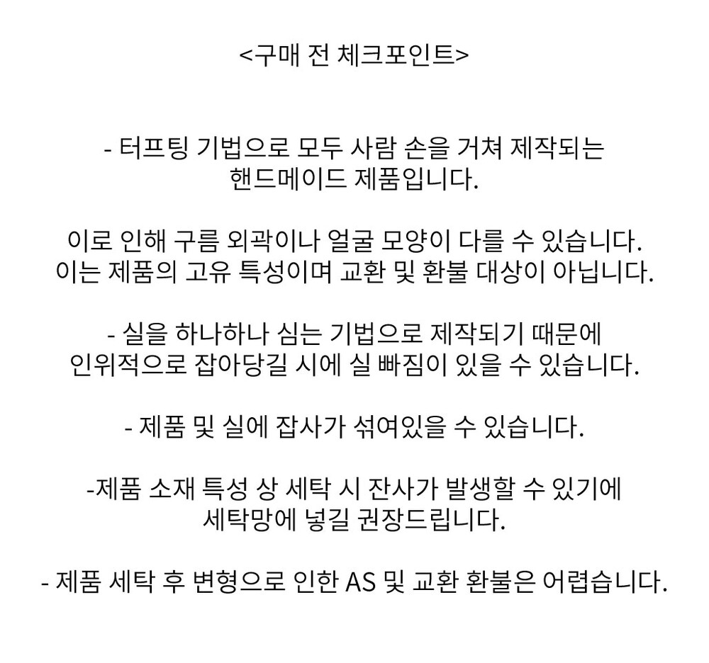 터프팅 기법으로 모두 사람 손을 거쳐 제작되는 핸드메이드 제품입니다.