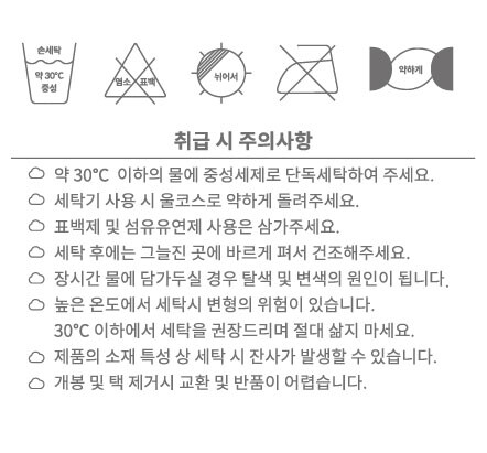 세탁시 찬물 단독 손세탁을 권장하며, 세탁기 사용 시 세탁망을 사용해 주세요.