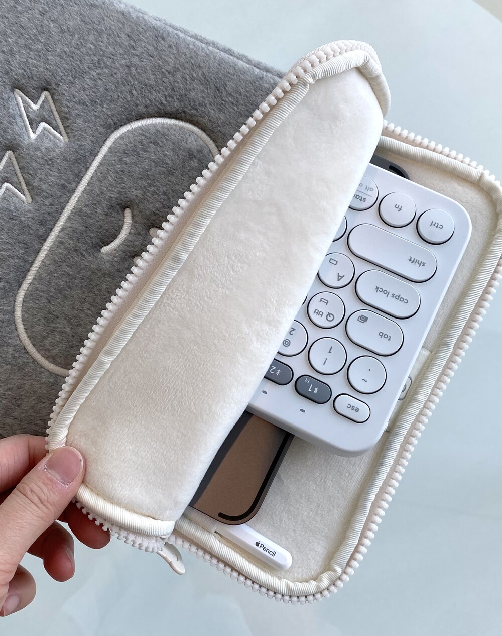 (11인치 아이패드 파우치에는 로지텍 무선 키보드도 함께 담을 수 있습니다.)