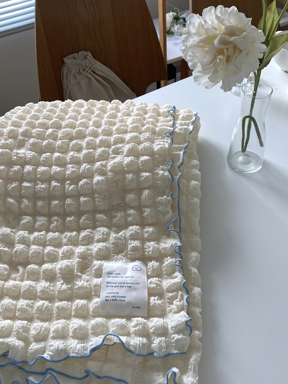 파란 하늘을 연상시키는 파란색 실로 마감한 여름 이불입니다.